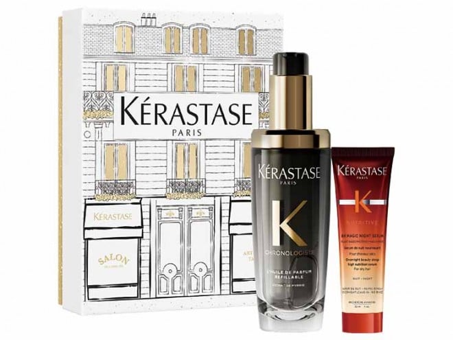 朝も夜もケラスターゼで贅沢なケア体験を!ブランド最高峰のヘアオイル『ユイル クロノロジスト N』と夜用ヘア美容液『マジック ナイト セラム R』のコフレ。外出時のダメージから髪を守り、寝ている間に集中ケアしてスタイリングしやすい滑らかな髪をキープ。
