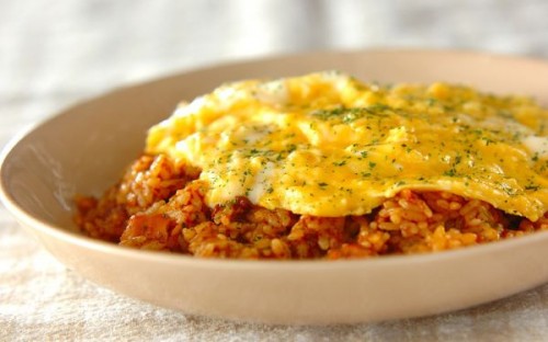ケチャップの代わりに、ミートソースでご飯を味つけした贅沢なオムライスです。肉と野菜の旨味いっぱいのミートソースにふんわり卵がよく合います。卵は包まずにのせるだけなので、手軽にできますよ。