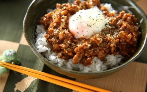 ミートソースはパスタだけでなく、ご飯にかけて食べるのもおすすめ。とろ〜り温泉卵をからめれば、よりマイルドに。手軽に作れて、子どもも喜ぶメニューです。