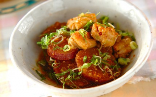 コチュジャン&みそでコク旨な煮物です。サツマイモの甘さとホクホクとした食感がよいアクセント。刻みネギをパラリと散らせば、彩りもバッチリです。ビビンバやナムルと合わせると、韓国風定食にもなりますよ。