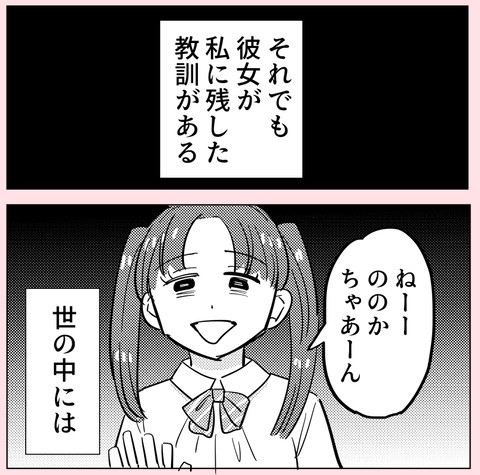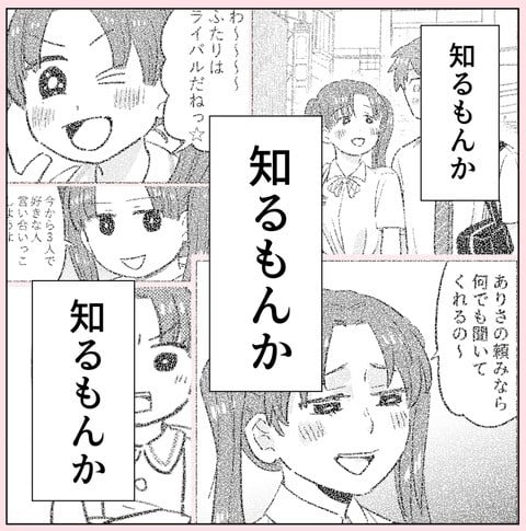 ののかはこれまで、幼なじみのありさによって何度も振り回され、嫌な思いをしてきた。特に高校生になってバイト先で再会し前より仲良くなった際は、最終的にありさが自分を利用していることに気づき、関わりを断つのだった。しかしありさからSNS経由でメッセージが来る。そこには謝罪の気持ちと、あの日嘘をついたのは彼氏に怒られると思ったからだと理由が書かれていた。これに対しののかは「知るもんか」思うのだが…。