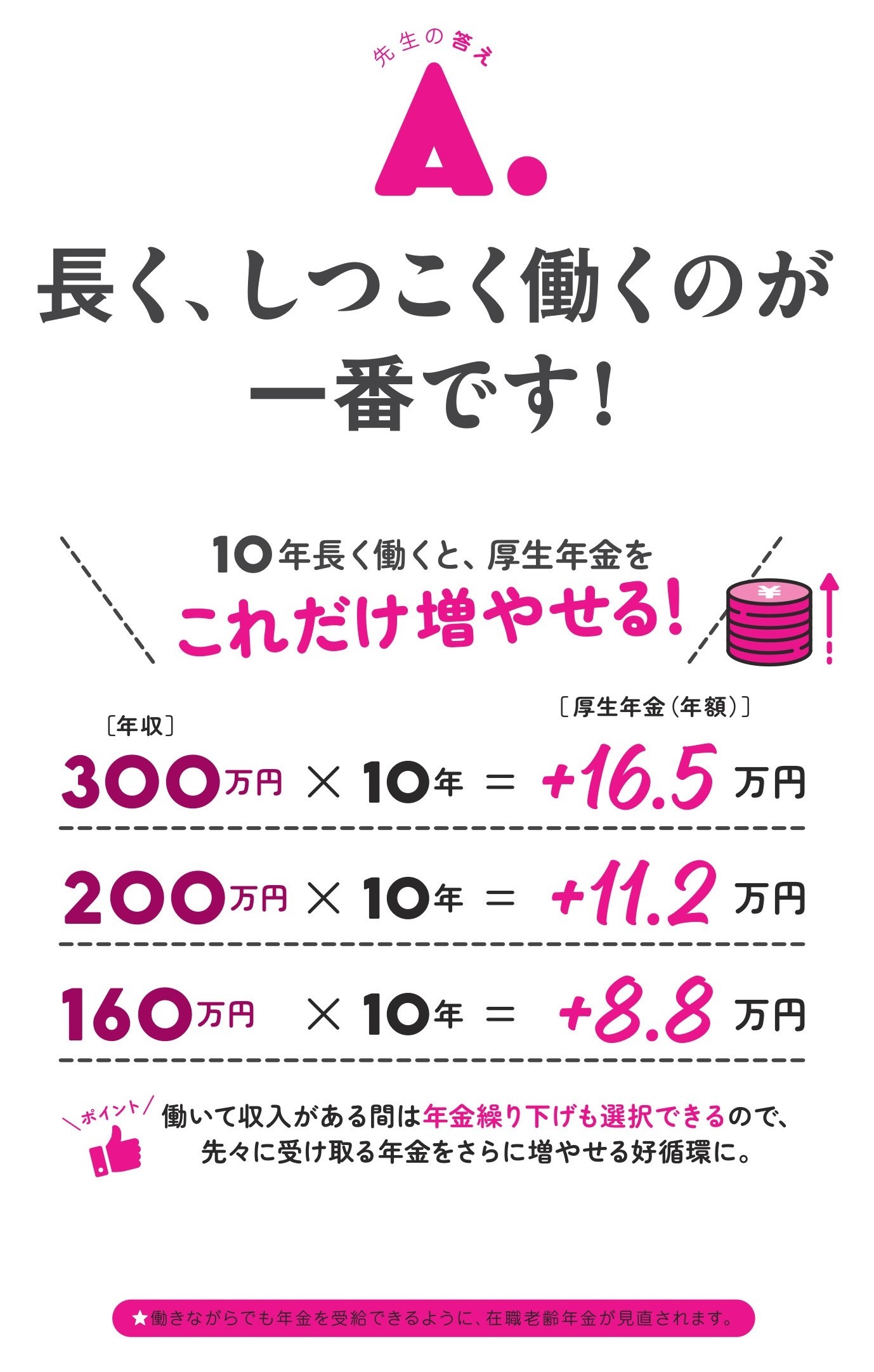 長く働くと、受け取る年金額も増えますし、「人のつながりや生きがいにもなり得る」と井戸さん。仕事のメリハリと、無理のない程度に頭や体を動かすことは健康にも役立ちそうですね。