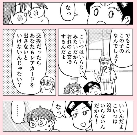 無理やりカード交換をしようとする小学生男子に、だったら「レアとレアを交換しなきゃおかしいっつってんだろ?」と詰め寄るのですが…!?