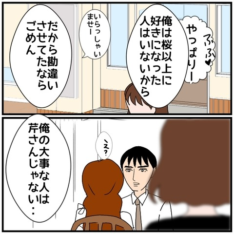 会話の中では、妻を軽んじるような無神経な発言が繰り返されましたが、夫は「俺にとって大切なのは芹さんではなく、妻なんだ」と、はっきり気持ちを伝えます。するとその場に、なんと妻が姿を現したのです…!
