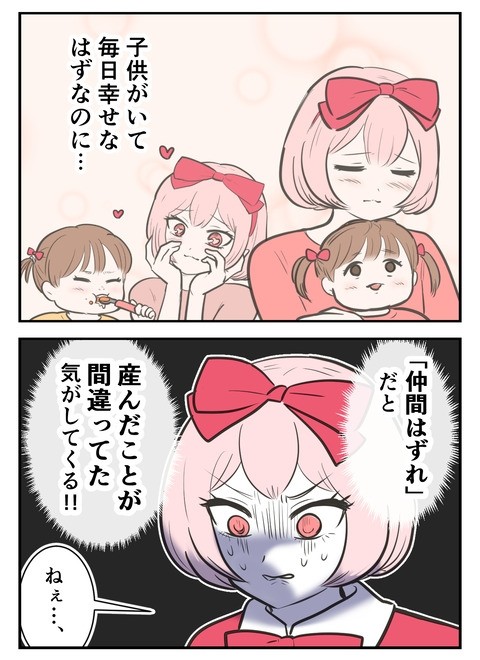 3年ぶりに大学時代の友人たちと集まった主人公。子どもは夫に預けて参加したものの、延々と子どもの写真を見せたり、友人の話を遮って子どもの話をしたりしてしまう。その様子を生暖かく見守る友人たちだったが主人公はおかまいなし。ついには「なんで子どもをつくらないの?」と聞いてしまう…