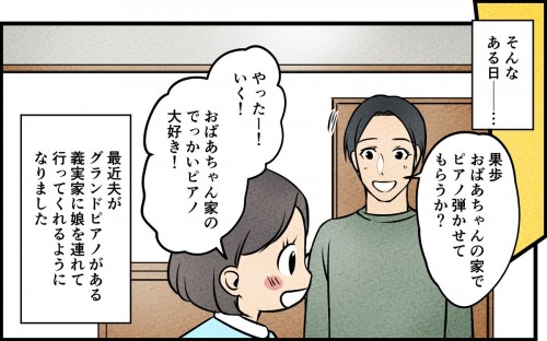 夫の隼人、娘の果歩と暮らす奈未。音大出身のゆうこ先生にピアノを習うようになってから、娘はピアノのレッスンに夢中。義実家にあるグランドピアノが弾けるよう、娘を頻繁に連れ出してくれる夫に奈未は感謝していました。しかしある時から夫が何か隠し事をしている気がして…