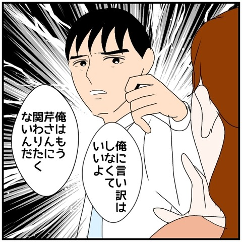 同僚・芹との距離感の近さから関係を疑われた夫は、離婚の危機に直面します。芹の夫・蓮斗を交えた四者で話し合いを行った結果、芹の嘘や裏切りが明らかに。蓮斗は裏切り相手の藤枝にこそ責任があるとし、芹との離婚を決意。帰宅後も芹の弁明を受け入れず、慰謝料を拒む主張にも冷静に対処します。引っ越しまでの猶予を与え、藤枝には内容証明を送ると告げました。芹は不利な状況に言葉を失います。その頃、草太夫妻は慰謝料の支払いを免れたことに安堵しつつも、妻は「すぐに信頼が戻るわけではない」と率直な思いを夫に伝えていました。