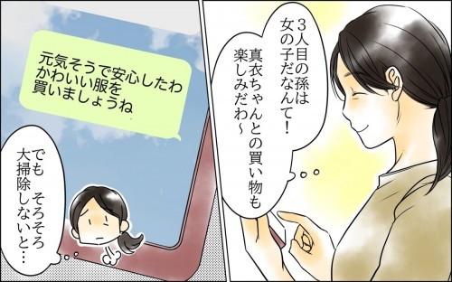葉子は次男嫁の真衣と赤ちゃんの洋服を買いに行く日に、葉子自身がするつもりだった法事に向けての片づけを長男嫁・朋夏に頼むことにしました。