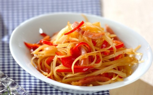 ジャガイモとソーセージの組み合わせが新鮮で、食感のコントラストが楽しい一品です。赤ピーマンで彩りを添えて、食卓がパッと明るくなりますよ。水にさらして炒めると、パリッと仕上がり風味が倍増します。