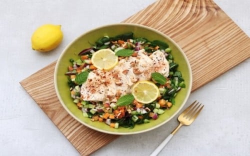 お好きな野菜やサラダチキンをボウルに入れたら、刻んだナッツをたっぷり散らし、自家製レモンマヨドレッシングをかけて召し上がれ! ナッツの食感で最後まで飽きずに食べられます。効率よく栄養が摂れて、忙しい方にこそおすすめです。