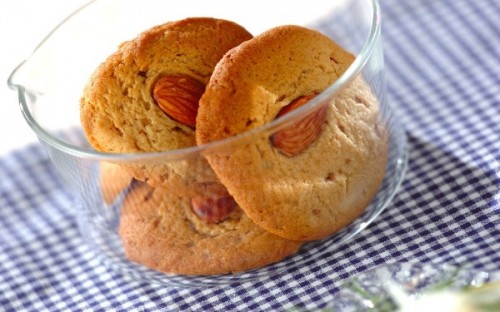 黒糖の香りとバターの風味で、ついつい手が伸びるおいしさです。スプーンですくって天板に落とすだけで、型抜きは不要。飾ったナッツがレトロでかわいらしく、食感と香ばしさがいいアクセントになります。