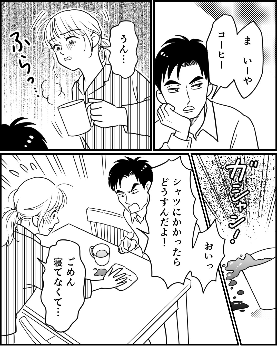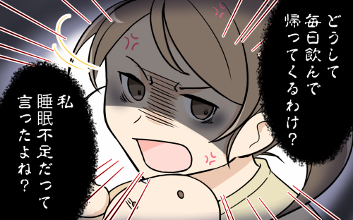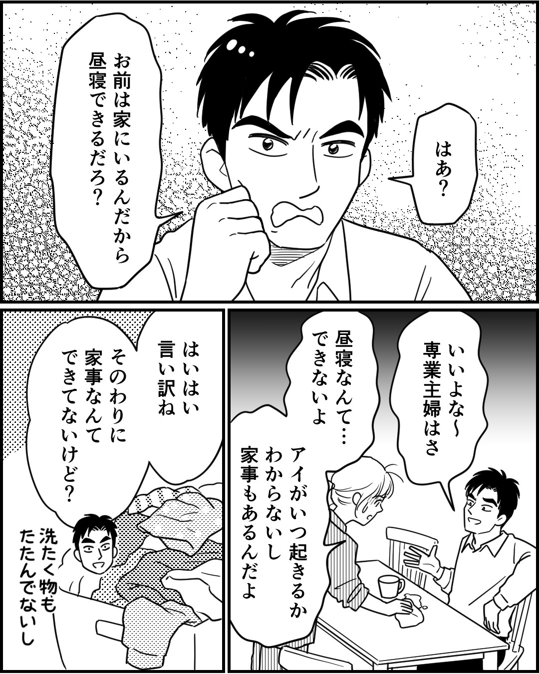 自分の発言を1ミリも悪いと思っていない夫…。寝不足の妻にこの暴言は許しがたいものがあります。妻はこのモラ夫を成敗することはできるのでしょうか…。