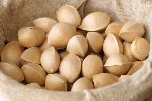 2、器に塩を敷き、ギンナンをのせる。(ヒント)殻が開いていないものは、ギンナン割りではさむか包丁の柄でたたくと簡単に開きます。