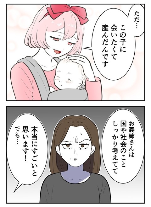 独身の義姉、子どもがいない義弟嫁、子どもが2人いる主人公。義実家に一堂に会したところ、義姉が子どもを産まない義弟嫁を責めはじめた。子どもを産まないと社会に迷惑をかけると主張する義姉に対し、主人公は社会のために産んだわけではないとキッパリ対応する。