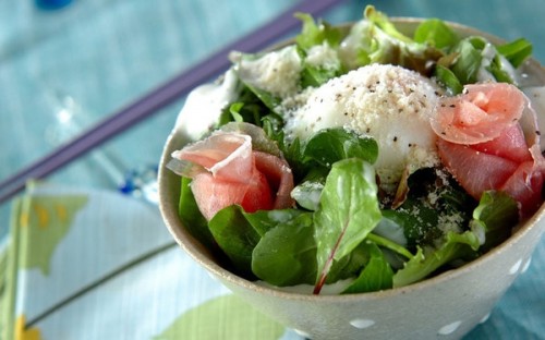 3、器に(2)を盛って生ハムをのせ、粗びき黒コショウをたっぷり振る。