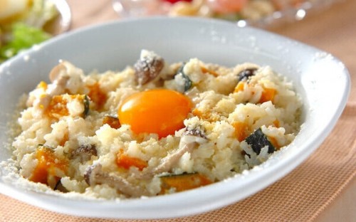 ごはんにカボチャやシメジの旨みがジュワッとしみ込んだ、本格的なリゾット。牛乳ベースのスープで煮込み、最後に卵黄をからめると、カルボナーラのようなクリーミーな風味が口いっぱいに広がります。