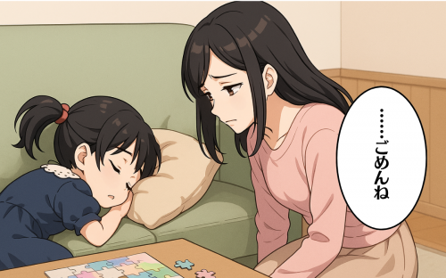 パズルは途中のままテーブルの端に寄せられ、所々に涙の跡が残っています。結芽はソファで小さく丸まって眠っていました。