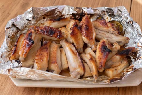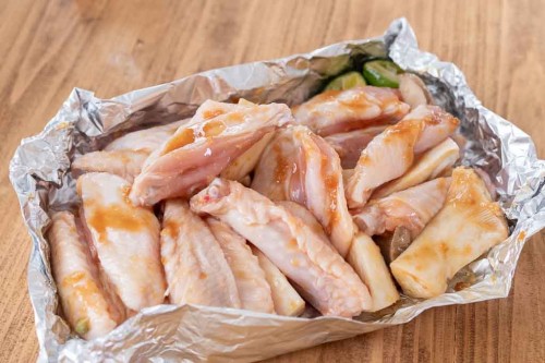 3、アルミホイルの上に1と手羽中をのせ、2をかける。
