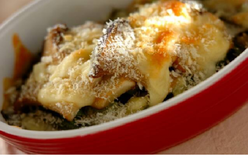 キノコが苦手な方でも食べやすい、グラタン風のアレンジ。エリンギと小松菜をソテーし、チーズをのせて焼いたら出来上がりです。簡単に作れるため、困ったときの一皿として役立ちます。小松菜は葉の部分だけ使うと苦味が和らぎ、より食べやすくなりますよ。