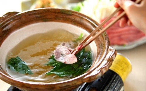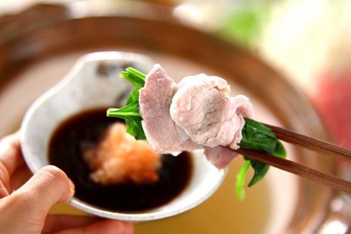 豚肉とホウレン草や小松菜などの葉野菜を、日本酒を入れただし汁で煮る料理。ポン酢しょうゆをつけて食べるのが基本ですが、つけダレに薬味を添えたり、具材を変えたりと、多彩に楽しめます。
