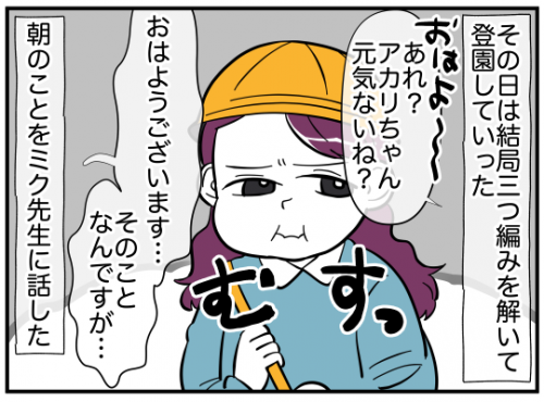 最近、おしゃれに興味津々な娘。これまでツインテールかポニーテールで登園していたが、その日の朝は「三つ編みをしてほしい」と言いだす。自分のヘアアレンジもほとんどしたことがなかった主人公は当然戸惑うが、可愛い娘のために挑戦するのだった…
