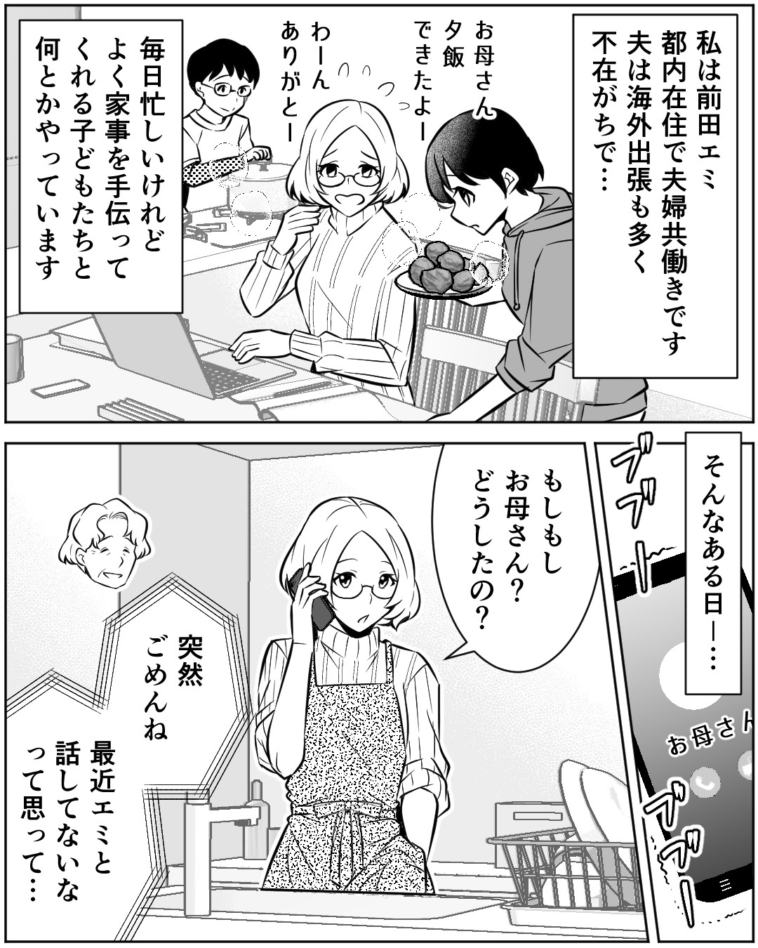 主人公の女性が久しぶりに実家を訪れると、母の様子が少しおかしいことに気づきます。同じことを何度も尋ねたり、少し上の空だったり…。さらに、家の中は以前と違って散らかっており、冷蔵庫の中も空っぽ。母は「お嫁さんは忙しいから」と兄の妻をかばいますが、その言葉とは裏腹に、母の表情はどこか寂しげです。本当に、ただ“忙しい”だけなのでしょうか。主人公の心に、兄夫婦への疑念が芽生え始めます。