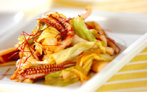 焼き肉のタレで下味をつけたスルメイカと、ざく切りキャベツの炒め物です。スルメイカのプリッとした食感とキャベツの甘みが絶妙にマッチ。ご飯のおかずやお酒のおともにも最適です。仕上げに糸唐辛子を散らして、彩りをプラスしましょう。