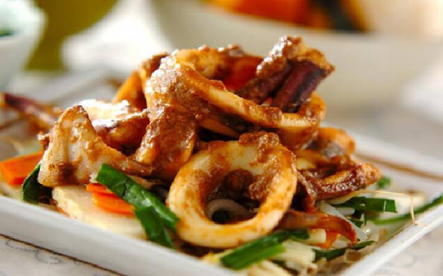 3、<調味料>を加えて全体に炒め合わせ、トロミがついてきたらイカを加えてからめるように炒め、器に盛る。