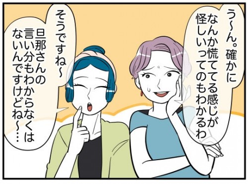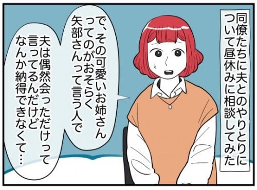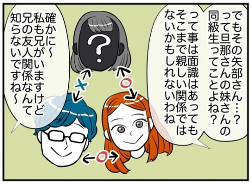 夫によると、公園で例の髪飾りをくれた“可愛いお姉さん”は「矢部さん」という人。おさがりをくれる義妹の友人で、髪飾りをくれた日も偶然会ったらしい。主人公がお礼を言いたいから会わせてほしいとお願いすると、連絡先を知らないから無理だと言いだす…