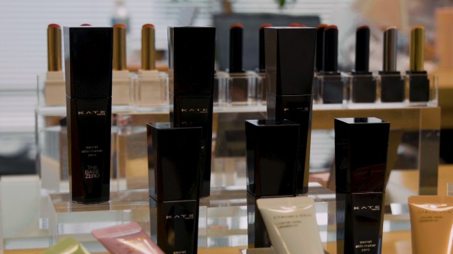 • リップを塗る。スキンケアの段階で、唇用美容液を塗っておく。リップを塗る直前にティッシュオフする。その後、リップ下地を塗り、口紅を重ねる。口紅は中央からのせて、グラデーションになるように徐々に外側へ塗り広げる。