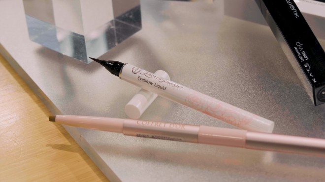 • アイブロウで眉毛を仕上げる。リキッド、ペンシル、パウダー、マスカラを使い、仕上げていく。まず、アイブロウリキッドとペンシルで、眉尻・眉頭の生えムラを補正していく。