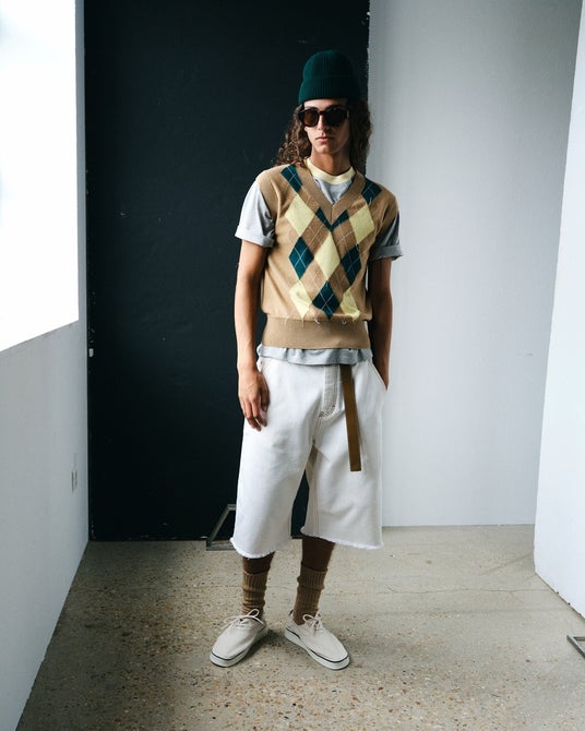 アーガイルニットベスト、カレッジストライプ、再解釈されたチェックやプレイドなど、ヘリテージパターンが美学の核を成しています。ブランドのエッセンスを体現する各ピース、ロングスリーブTシャツやピケポロ、ジャージースウェットに、ワイドレッグショーツやスポーティなパンツを組み合わせることで、それぞれのアイテムが個性を持ちながらも調和し、統一感のあるレイヤードスタイルを実現しています。