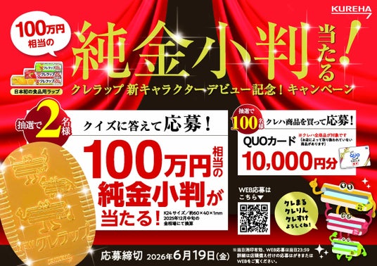 「クレラップ新キャラクターデビュー記念!キャンペーン」を全国の量販店、Amazon他オンラインショップ等で実施中。注目は「クイズに答えて応募コース」の景品で、抽選で2名様に100万円相当の”純金小判”が当たります!