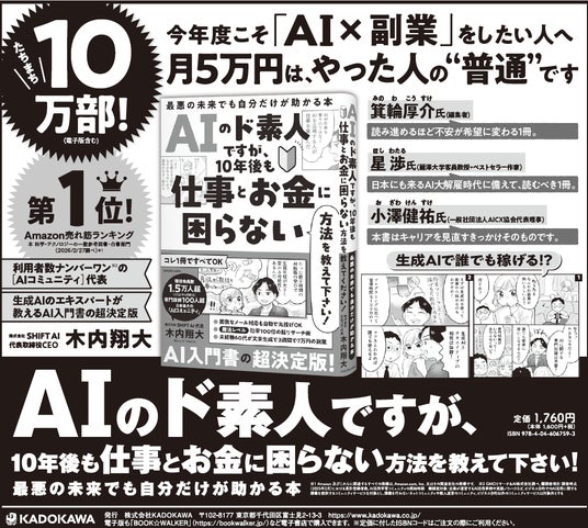 株式会社KADOKAWA(本社:東京都千代田区、取締役 代表執行役社長 CEO:夏野剛、以下KADOKAWA)は、木内翔大著『AIのド素人ですが、10年後も仕事とお金に困らない方法を教えて下さい! 最悪の未来でも自分だけが助かる本』が売れ行き好調につき、累計10万部を突破しました(電子版を含む)。本書は、全国の書店およびインターネット書店でお求めいただけます。