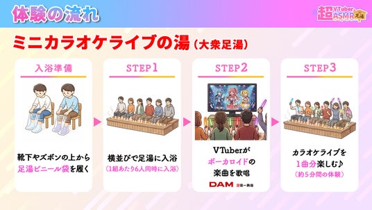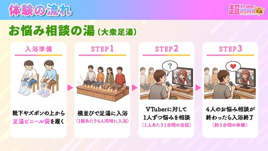 足湯には「癒しのASMR足湯」「お悩み相談の湯」「ミニカラオケライブの湯」の3種があります。