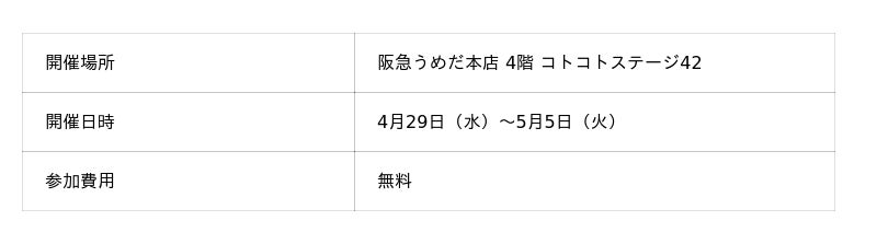 4月29日(水)〜5月5日(火)阪急うめだ本店 4階 コトコトステージ42にて開催
