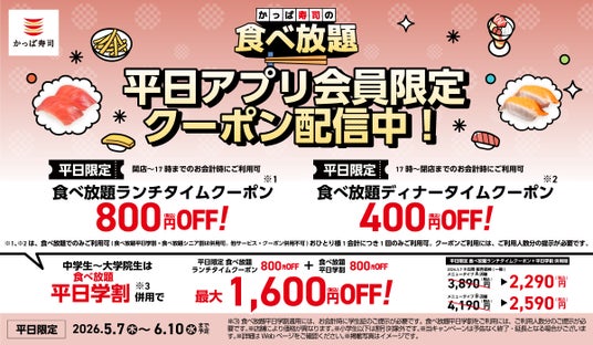 コロワイドグループのかっぱ寿司(カッパ・クリエイト(株) 本社:神奈川県横浜市、代表取締役社長:山角豪)は、2026年5月7日(木)より、アプリ会員限定の「食べ放題」平日クーポンを強化して配信いたします。あわせて、食べ放題限定の新メニュー『旬ネタ!期間限定セット』を、かっぱ寿司全店にて提供いたします。
